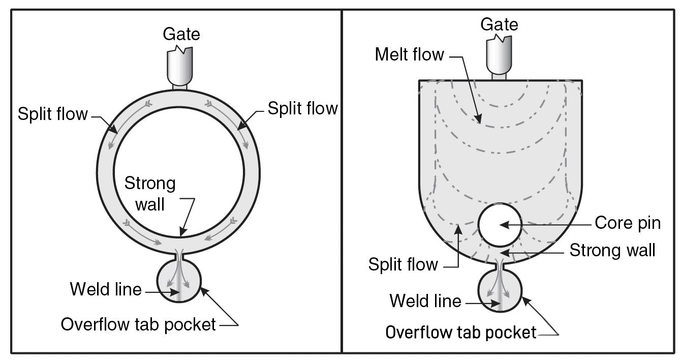 The illustration above reveals a classic piece of engineering wisdom: by adding an overflow pocket in front of the weld line, the melt is allowed to keep flowing. As a result, not only is the strength of the weld line restored, but the surface appearance is also greatly improved.